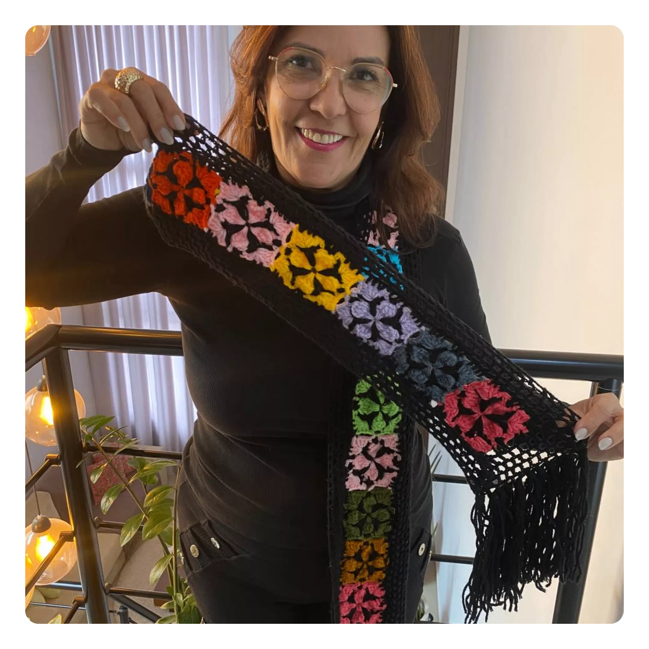 Tenho mais de 1000 alunas por todo Brasil e fora dele, aprendendo junto comigo as melhores técnicas de crochê para fazer peças únicas.